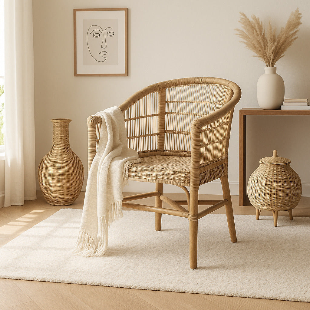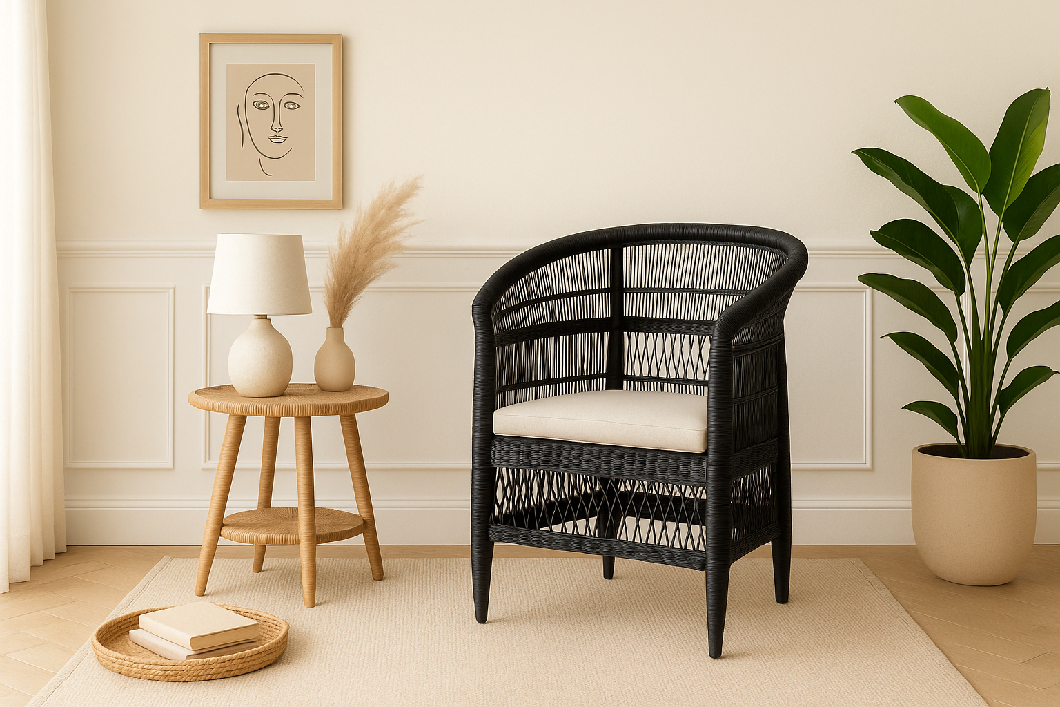 This styled corner exudes calm and intention a Malawoven chair draped in soft texture, grounded by earthy tones and clean lines. Where heritage craft meets editorial home aesthetics.