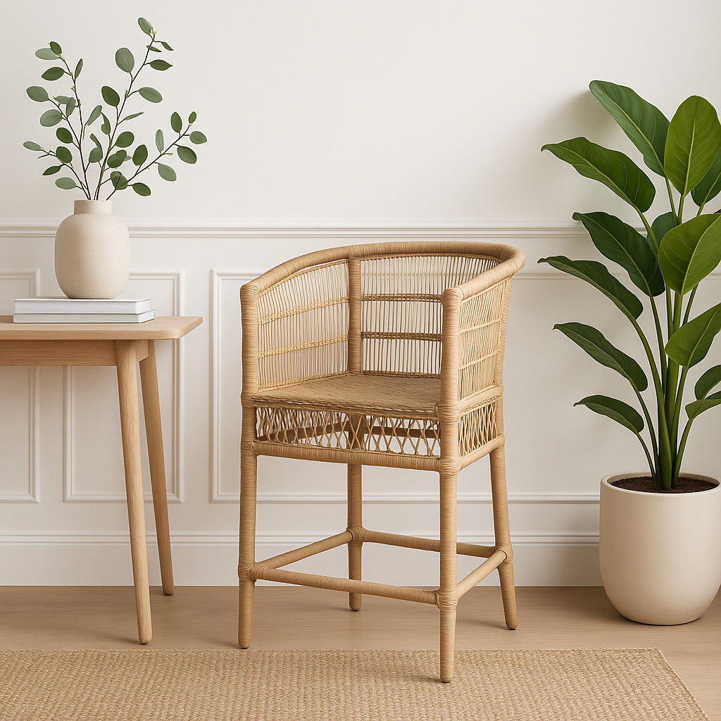 This handcrafted bar chair blends airy Malawian weaving with clean lines, offering a fresh take on natural interior styling. Paired with greenery and neutral tones, it radiates calm sophistication.